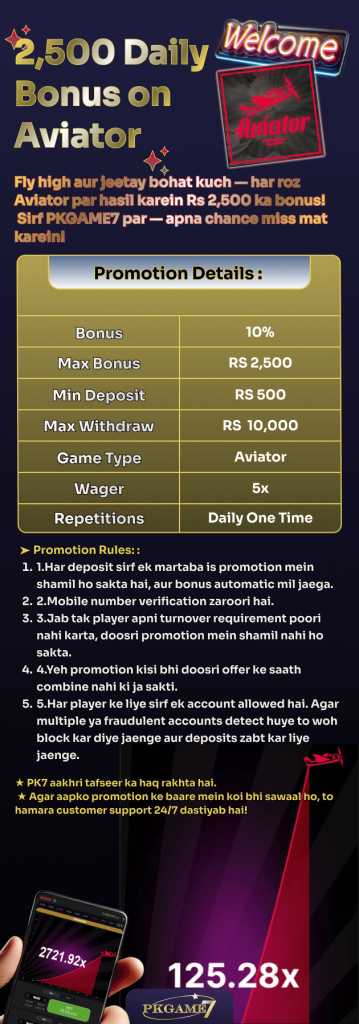 Rs 2,500 Aviator Deposit Bonus aik special promotion hai jo sirf AVIATOR game ke liye PKGame7 App par available hai. Yeh offer un Pakistani users ke liye design ki gayi hai jo Aviator crash game khelna pasand karte hain aur low turnover ke sath deposit bonus hasil karna chahte hain.