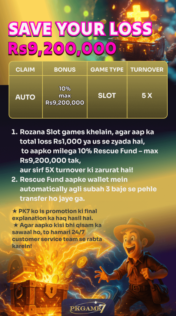 Save Your Loss – Rs 9,200,000 Rescue Fund Bonus aik special promotion hai jo PKGame7 App par slot games khelne walay Pakistani users ke liye design ki gayi hai. Is offer ka maqsad yeh hai ke agar kisi din slot games khelte hue loss ho jaye, to us loss par 10% rescue fund (cashback) diya jaye.